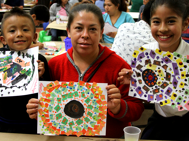 This was a notable night for so many reasons. Not only was it the first time we had hosted such an event where whole families could relax and make art together — it was an event that brought together families, friends, school staff, and community organizations. P.S. ARTS helped support this event by bringing three staff members along, and we also had eight Burbank staff members, including our principal, and five volunteers from a San Diego-based arts organization, Collaborations: Teachers and Artists* (CoTA). Because of these helping hands, about 50 families (totaling nearly 150 people) were able to relax and enjoy a hands-on art-making event that was created just for them.