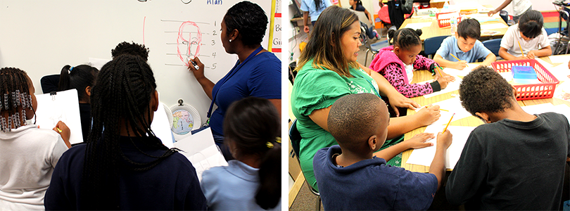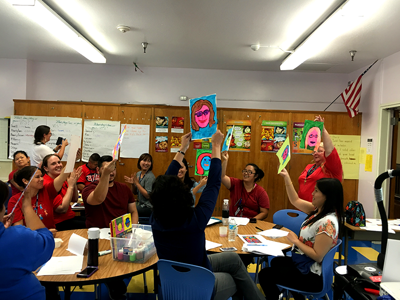 On October 11th, the halls of Florence Griffith Joyner Elementary School were transformed into a vibrant, colorful art gallery. Every inch of wall space held a student-created self-portrait in the style of a famous artist. Mothers, fathers, siblings, and grandparents streamed through the front door in droves, stopping to admire the work and talk to their children about the process of creating their masterpieces. Everywhere you turned, a student was shouting “Look at my art!” or explaining their inspiration to friends and family. Parents stopped to write “Artist-Grams,” to be delivered to classrooms later in the week, for their children telling them how proud they were. Outside, families posed for their own portraits taken by a professional photographer. It was our school’s first art show, and our first event as a Turnaround Arts: California partner school, and it all started at the Turnaround Arts Summer Leadership Retreat.