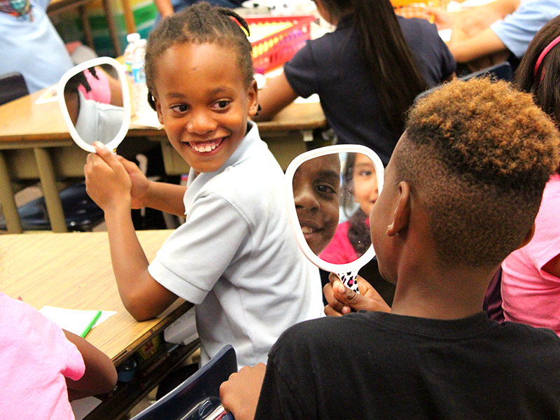 We kicked off the project with a professional development session in which teachers learned the Elements of Portrayal and studied the same portraits used at the summer retreat. Then, each grade-level was assigned an artist to study for inspiration. I selected artists based on the developmental level of the students. Pre-K and Kindergarten students studied Todd Parr (author and illustrator of It’s Okay to be Different and The Feelings Book), 1st grade focused on Matisse cut-outs, 2nd grade on Paul Klee, 3rd grade on Faith Ringgold’s beautiful story quilts, 4th grade on Frida Kahlo, and 5th grade on Amadeo Modigliani. Each grade-level received a variety of pictures and books to help them get to know their artist, along with a collection of lesson plans inspired by their artists.
